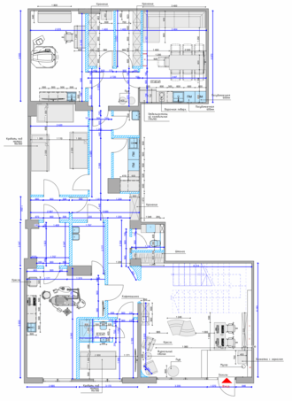 Сделали акцентные стены, продумали зону администрации и добавили цветное стекло на лестнице. На втором этаже — многоуровневые потолки в коридорах, спокойная цветовая гамма и удобные места для ожидания у кабинетов. Разработали типовое решение для рабочих кабинетов.
