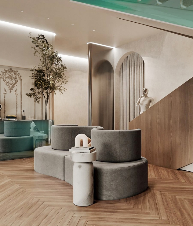 Отдельное внимание уделили комнате отдыха для персонала и ярким санузлам, которые разбавляют общую сдержанную атмосферу. Получился лаконичный, но выразительный интерьер медицинского центра.