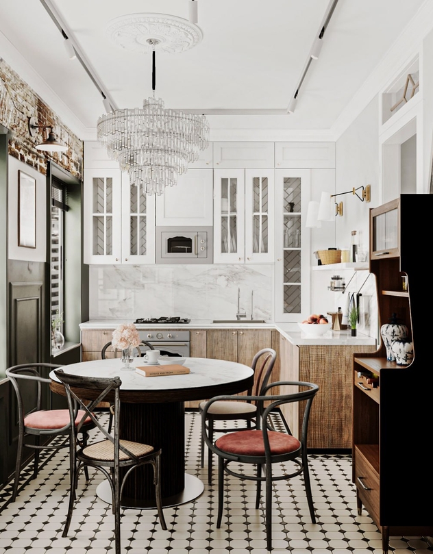 Ретро-квартира с историей. На кухне мы сделали верхние фасады со стеклом и перемычками, а в процессе обсуждения сформировали общую концепцию. Особую атмосферу создали детали: плитка с рисунком питерских парадных, семейные венские стулья и буфет с Удельного рынка. Люстру нашли на Авито.
