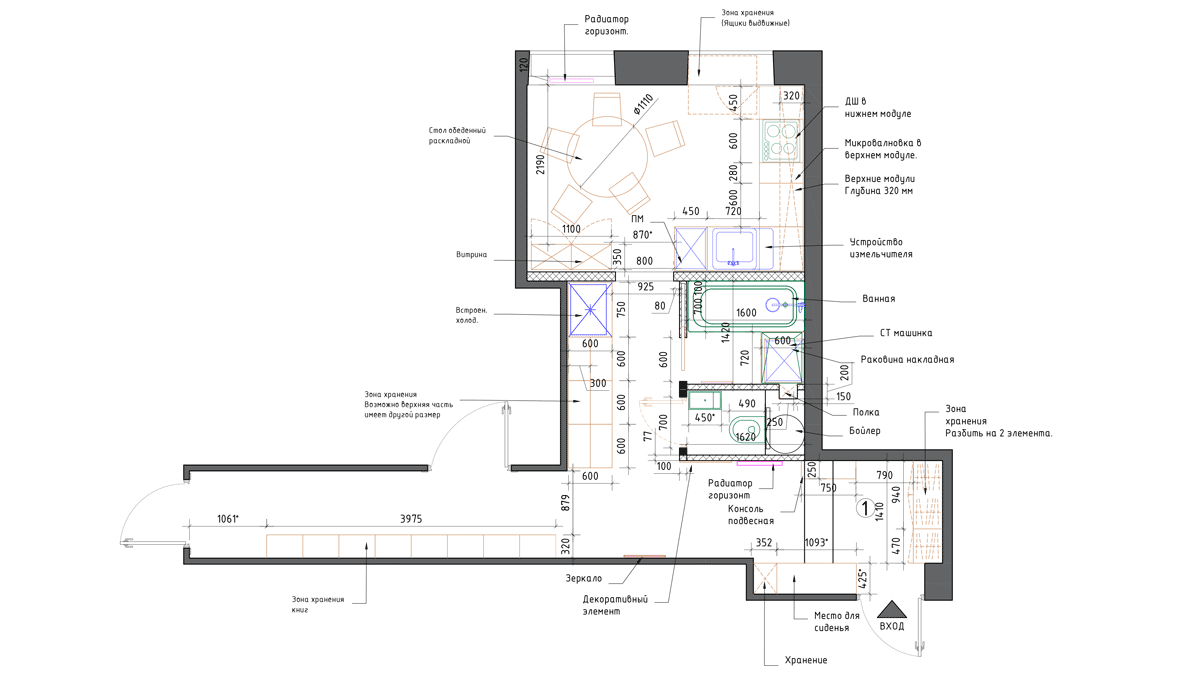 Во время ремонта открылась кирпичная стена - мы сохранили её лучшие фрагменты, добавив современные арочные молдинги. В прихожей обнаружили старый дымоход (квартира на последнем этаже), который укрепили и заложили, оставив лишь декоративную балку с зеркалом.